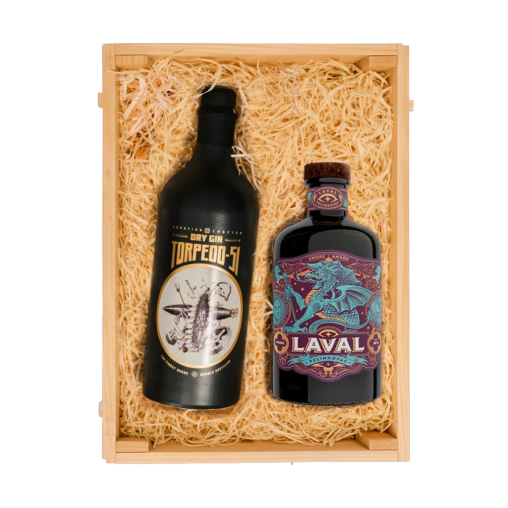 Premium poklon paket Laval 0,7L + Torpedo-51 0,7L kombinira dva najpoznatija proizvoda Suza TB destilerije – aromatični Laval Pelinkovac i karakteristični Torpedo-51 Dry Gin. Smješteni u elegantnu crnu drvenu kutiju sa slamom, ovi craft alkoholni proizvodi predstavljaju idealan izbor za sve ljubitelje kvalitetnih hrvatskih pića, kao i za poslovna i osobna darivanja. Ovaj ekskluzivni box ističe tradiciju, dizajn i vrhunsku kvalitetu domaće proizvodnje.