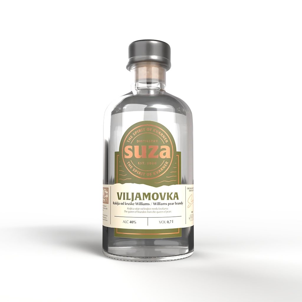 Vilijamovka Suza – The Spirit of Kvarner je vrhunska rakija od kruške sorte Williams, proizvedena od pažljivo odabranih, svježih plodova vrhunske kvalitete. Proces strogo kontrolirane fermentacije, potaknut selektiranim voćnim kvascima, te tradicionalna metoda duple destilacije osiguravaju čistoću i eleganciju okusa. Nakon destilacije, vilijamovka odležava godinu dana kako bi razvila bogatu, intenzivnu aromu i prepoznatljiv voćni karakter. Izražajna, sofisticirana i dugog završetka, idealan je izbor za istinske ljubitelje premium voćnih rakija.